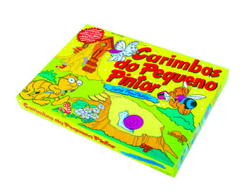 Cada caixa é composta de 4 carimbos em borracha, almofada para carimbos e tubo de tinta pincel com pastilhas de aquarela para pintura, folhas de papel com desenhos.